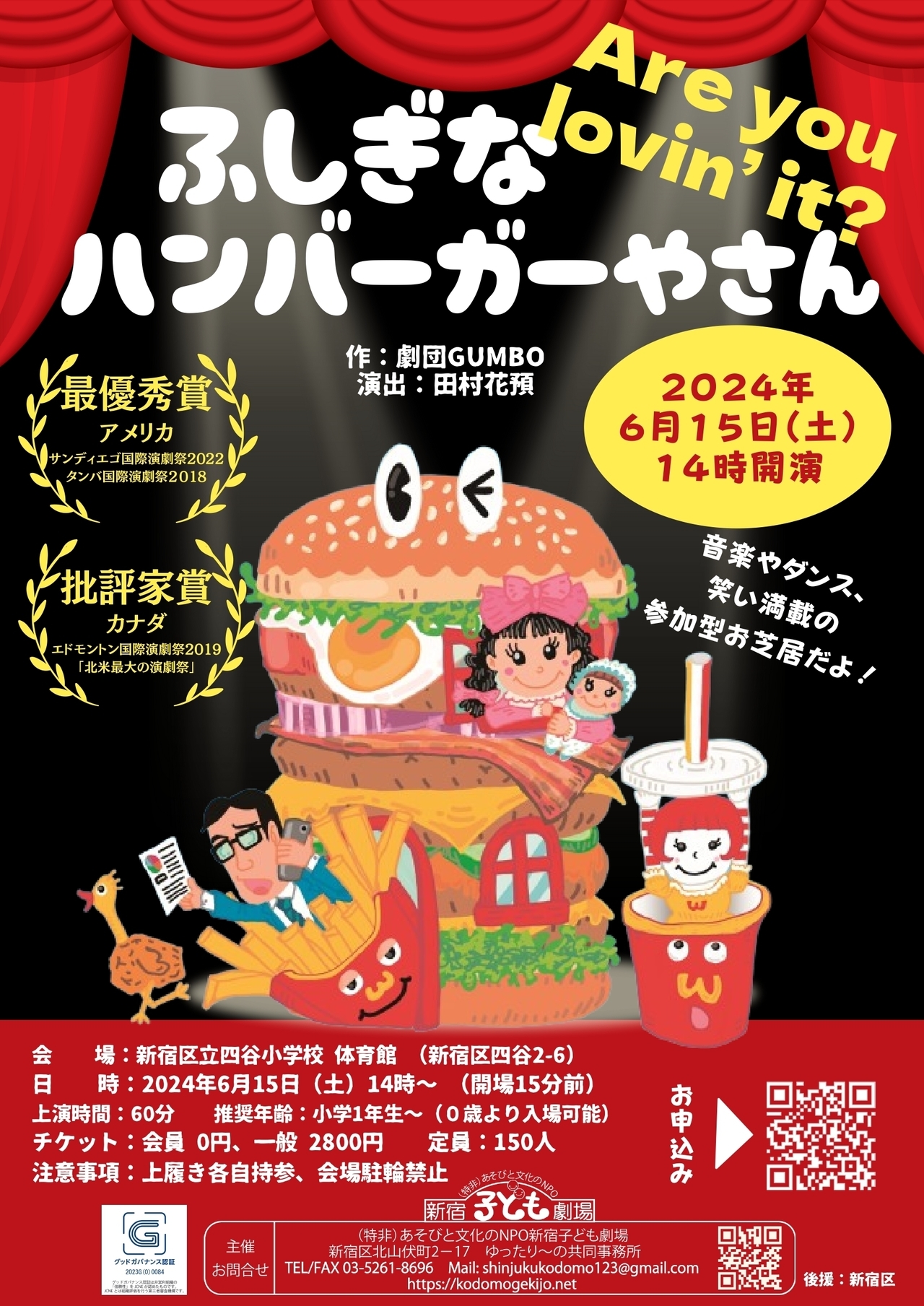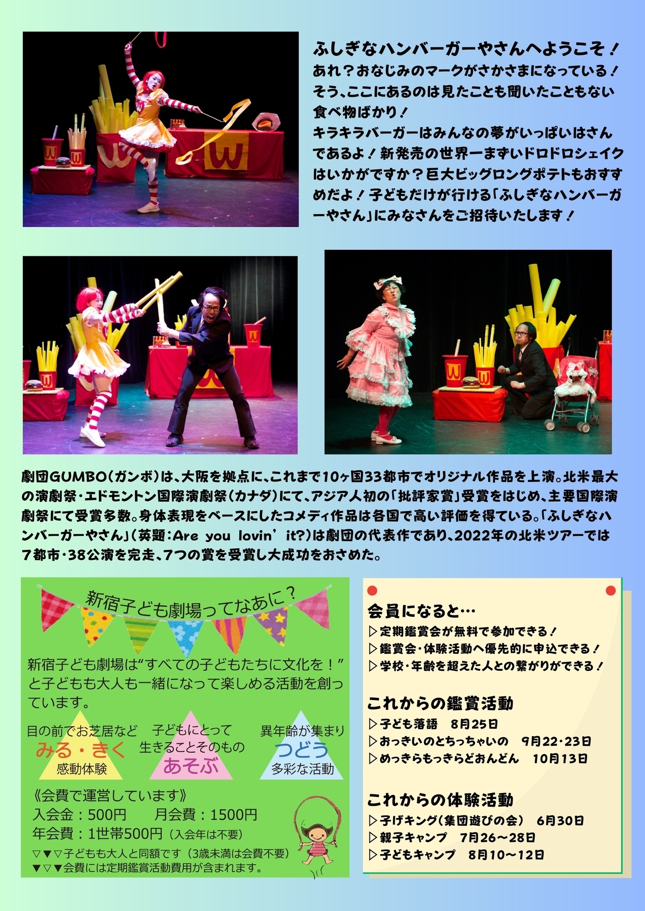| 世界の演劇祭で13冠に輝く劇団GUMBOの代表作 ★定員になりましたので、受付を終了します。6月9日実施の新宿子育てメッセにて追加募集をします。メッセ会場の新宿子ども劇場ブースにて「ふしぎなハンバーガーやさんぶんぶんゴマ」を入手の上お申込みください。(10名限定優待割引あり) | |||