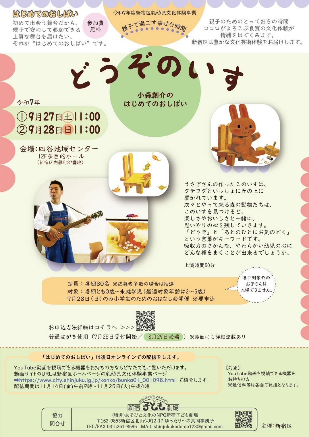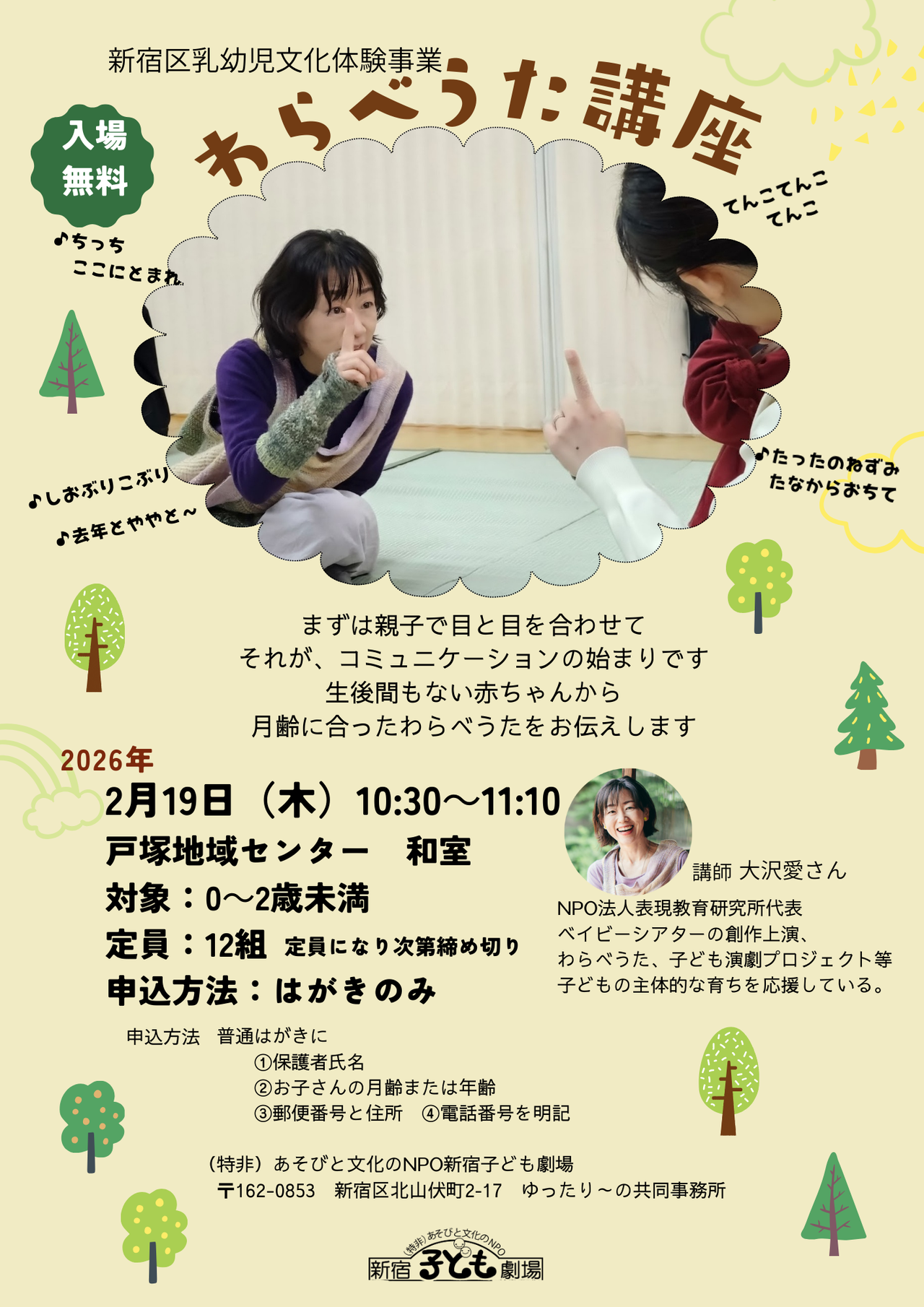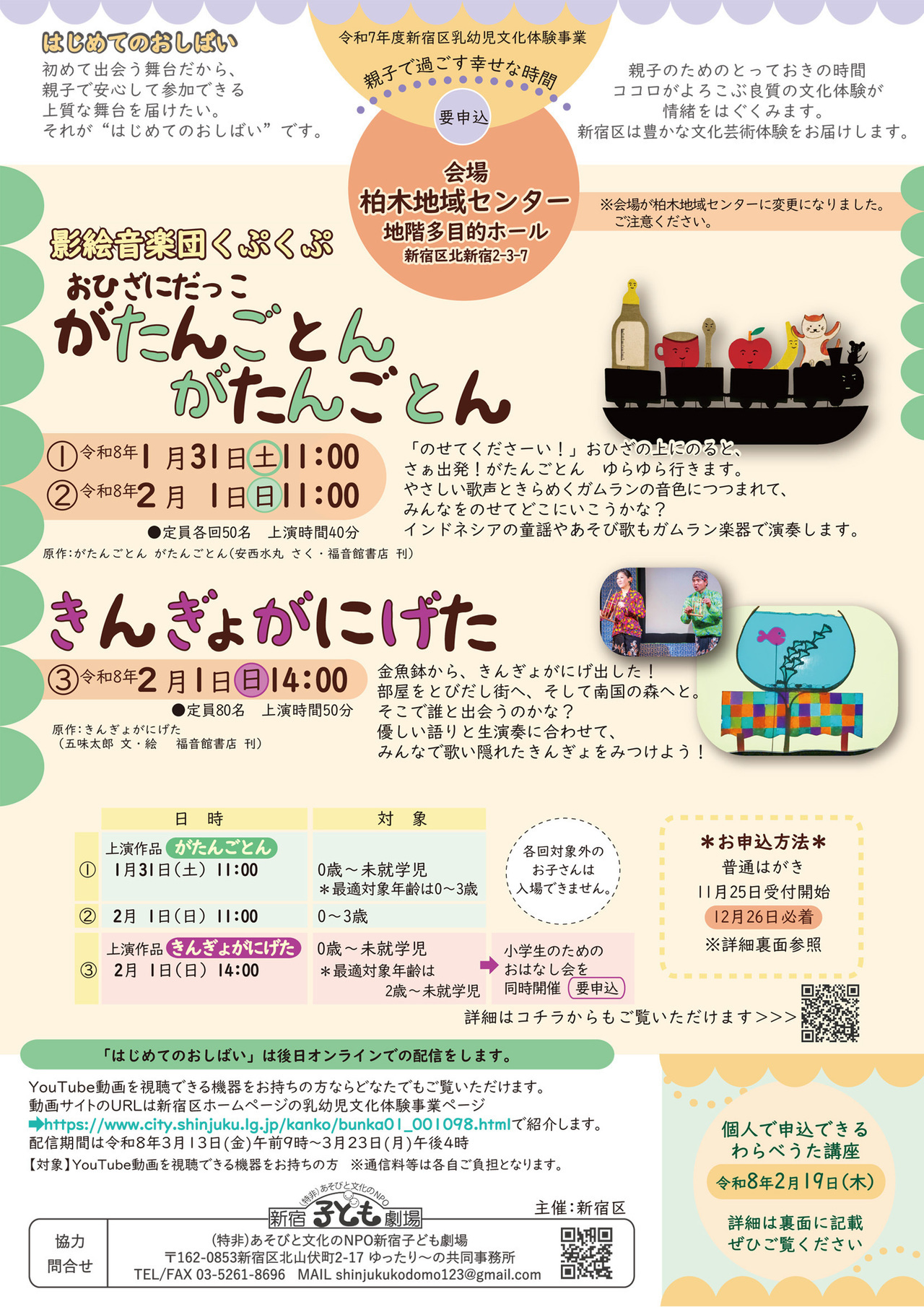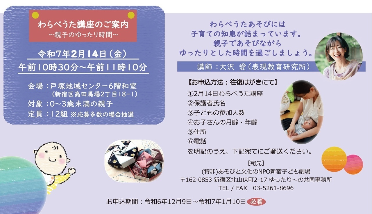 | 申込方法 | 新宿区ホームページの乳幼児文化体験事業ページにて | ||