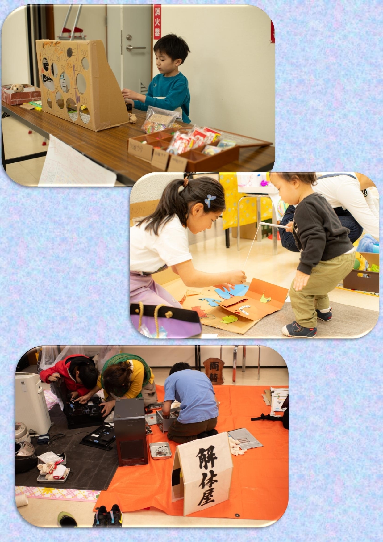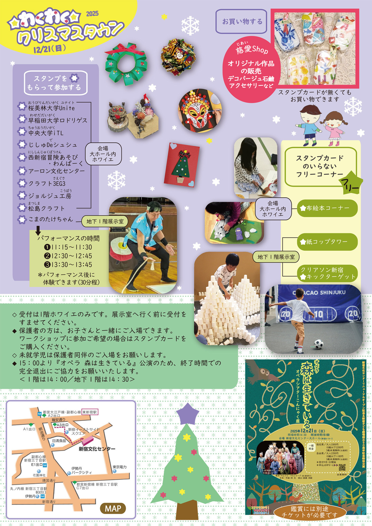 | 9つのワークショップと「こまのたけちゃん」、クリアソン新宿によるキックターゲットなど体験コーナーがたくさん! 〇中央大学 iTL・・・紙コップロケットづくり 〇早稲田大学環境ロドリゲス・・・廃材利用ワークショップ 〇じしゅDeシュシュ・・・オリジナルシュシュづくり 〇西新宿冒険あそびわんぱーく・・・毛糸と身近なものでアート 〇アーロン文化センター・・・オリジナルお面作り(京劇のお面) 〇クラフト3EG3・・・クリスマスカード作り 〇ジョルジュ工房・・・アフリカンファブリックでバッジ作り 〇松島クラフト・・・松ぼっくり工作 〇こまのたけちゃん・・・パフォーマンス&ワークショップ 〇クリアソン新宿・・・キックターゲット 〇布えほんコーナー 〇紙コップタワー ☆慈愛Shop・・・オリジナル作品の販売