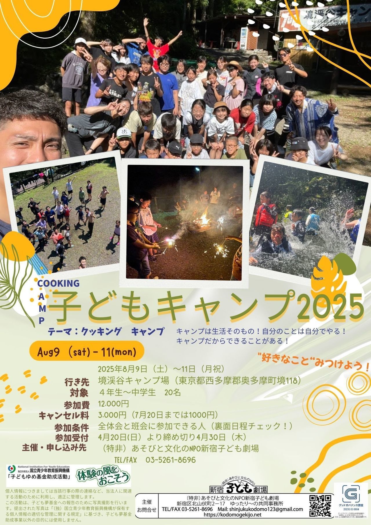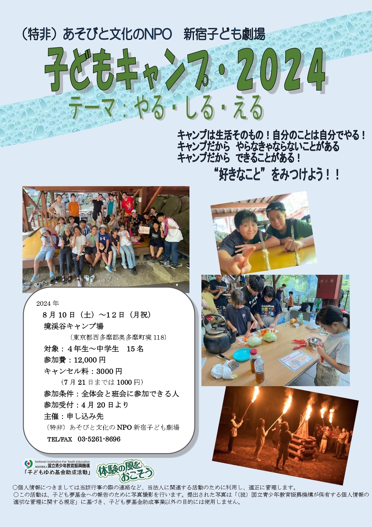 | その他 | 小学校4年生以上の子どもと青年で、キャンプのプログラムやメニュー、食材も自分たちで決めて行きます。キャンプ当日だけでなく、事前の準備やあそびを通して、仲間を作っていきます。