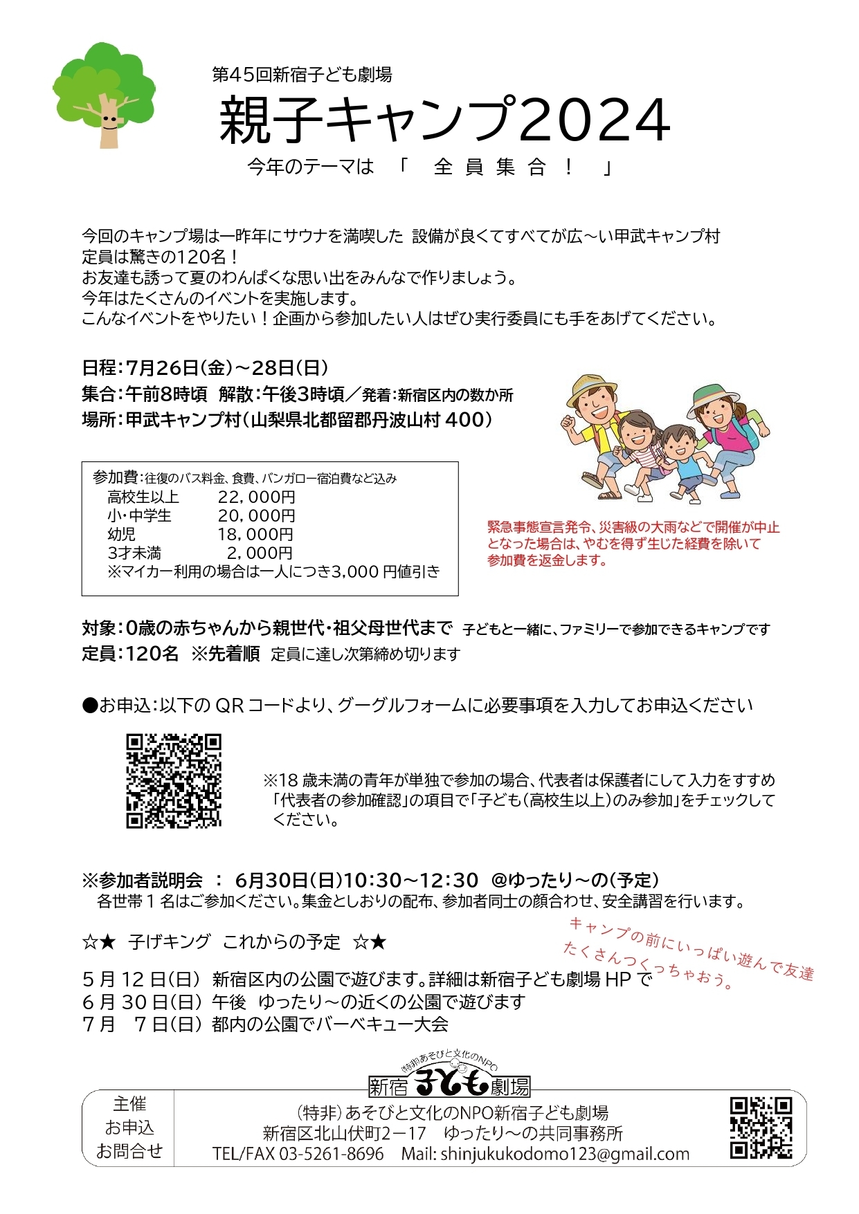 | その他 | バスをチャーターして行く赤ちゃんから参加可能のファミリーキャンプです。 中学生以下は保護者同伴でご参加ください。
